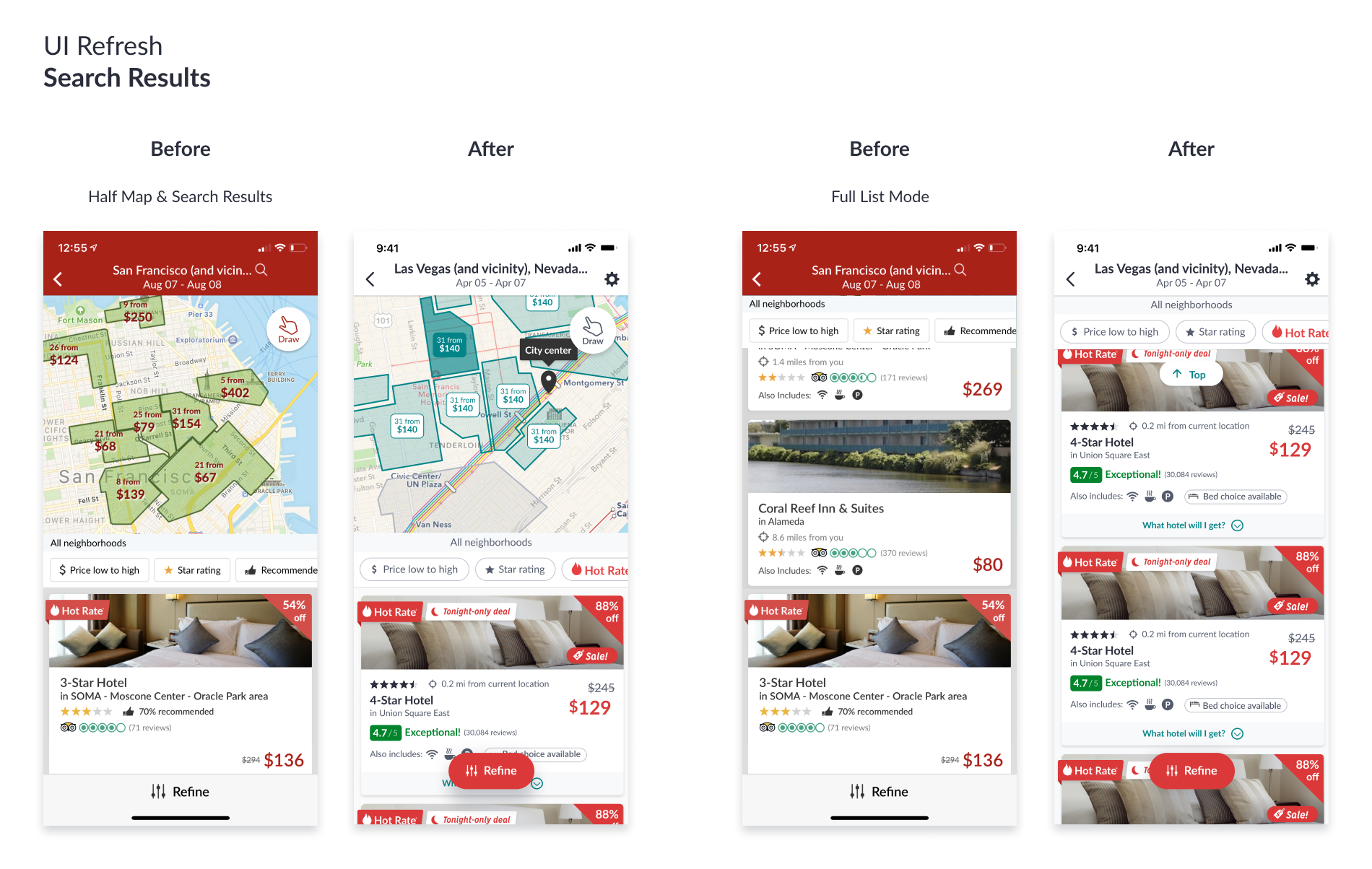 As a customer on the Hotwire app, I would like to see a consistent experience no matter where I choose to search or book. Android and iOS platforms have become distinct experiences that share a similar UI, but are still drastically different.