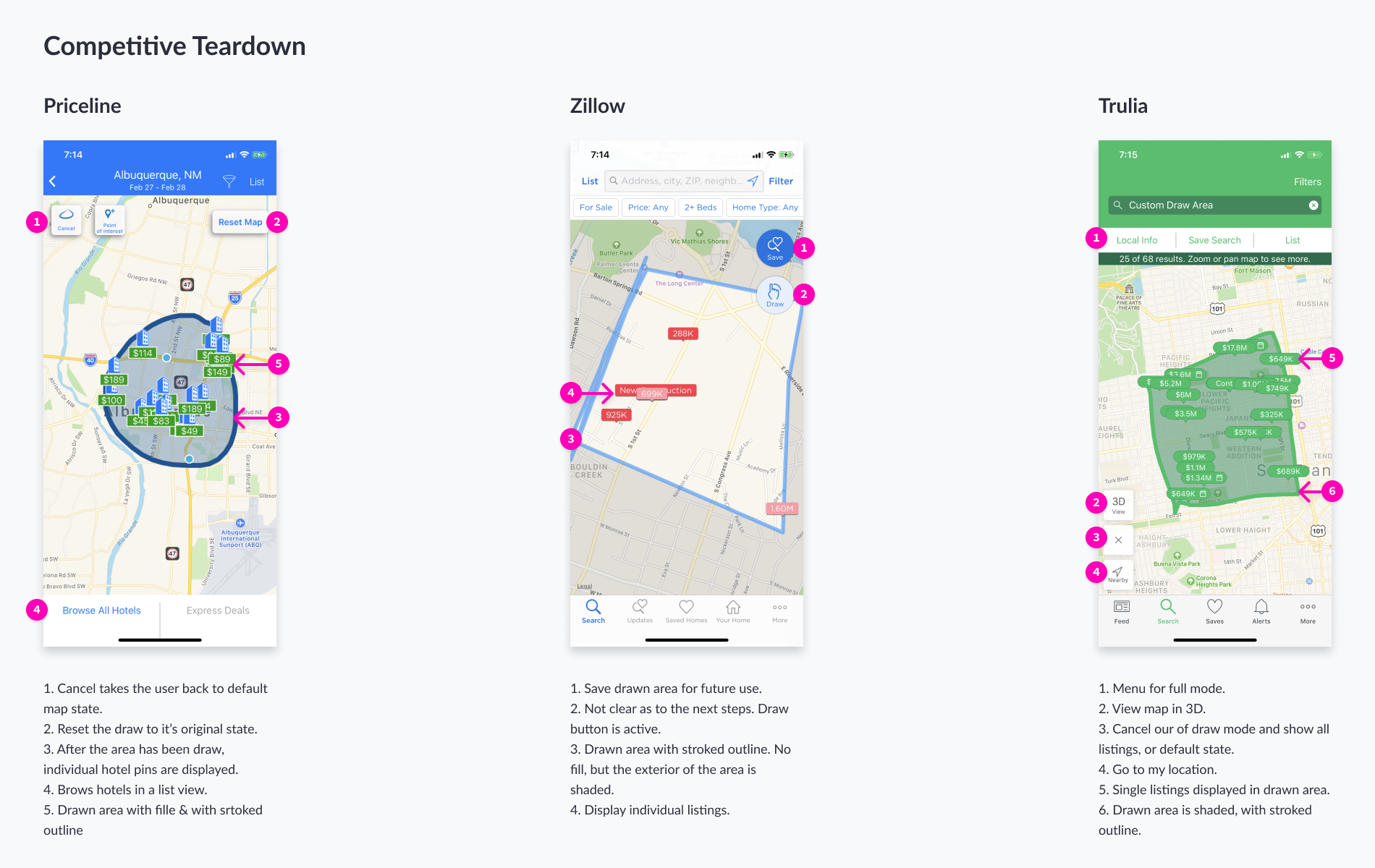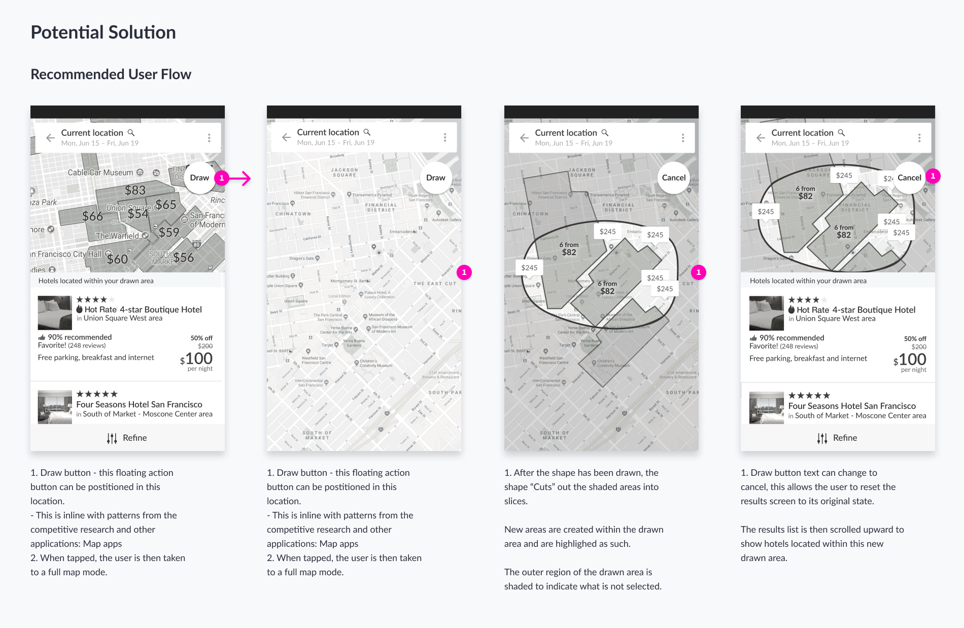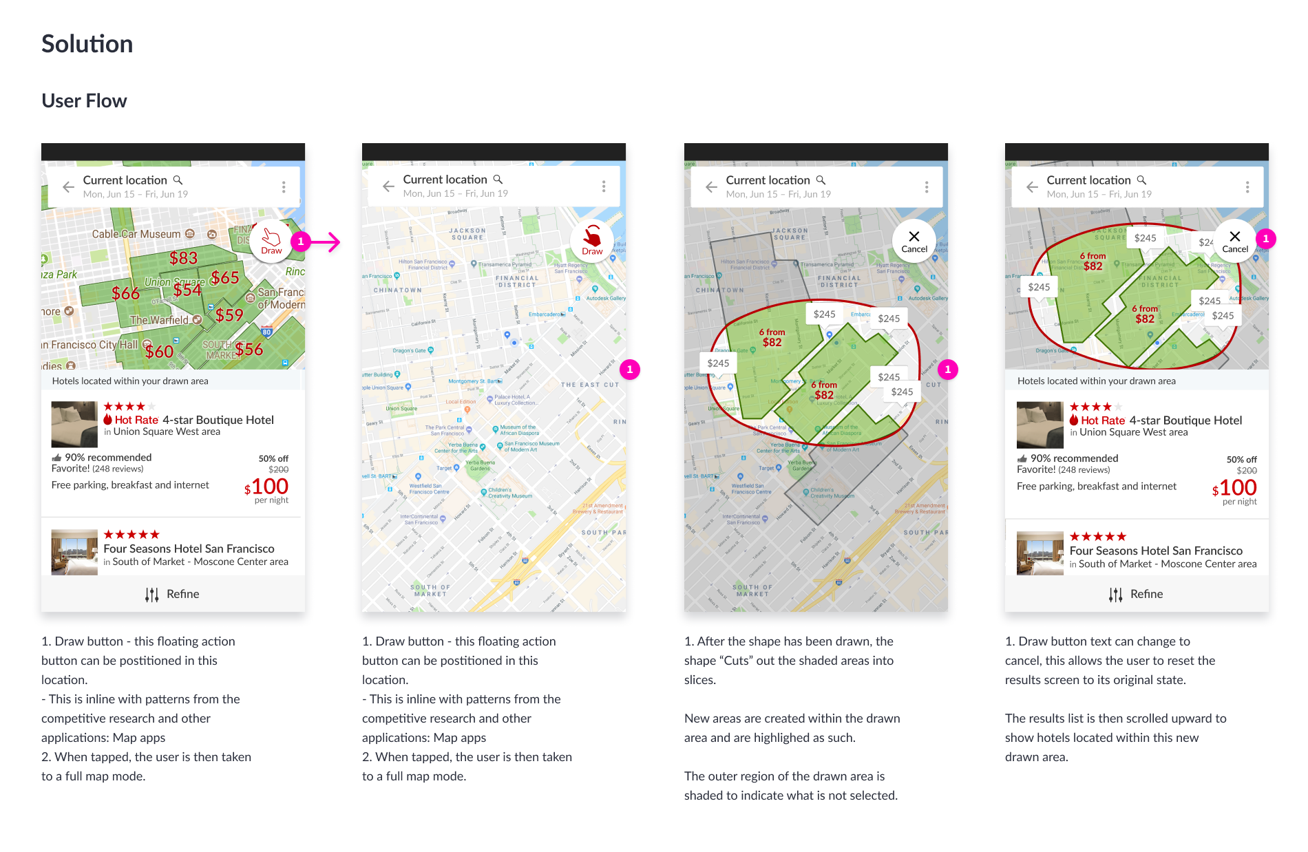 Introducing a feature to allow users to draw, and highlight an area of their choosing. This will provide users the ability to narrow down their search and select a hotel listing in the location of their choice.